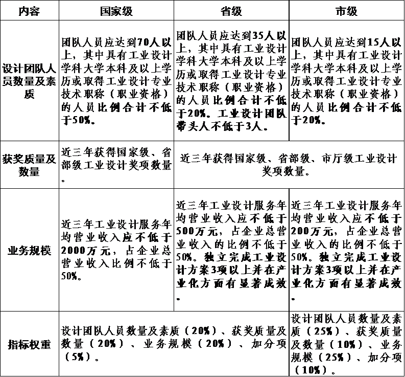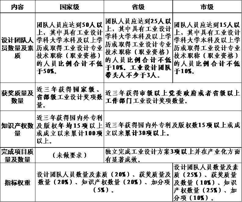《办法》附件包括市级工业设计中心主要评价指标、市级工业设计中心申请表、青岛市工业设计中心年度情况统计表。其中,市级工业设计中心主要评价指标分为企业工业设计中心评价指标和工业设计企业评价指标,明确了申报市级工业设计中心需满足的基本要求和各项评价指标所占权重,并对评价指标中各名称做出了解释说明;市级工业设计中心申请表和青岛市工业设计中心年度情况统计表分别对市级工业设计中心的申请和我市工业设计中心的日常管理做出了规范。