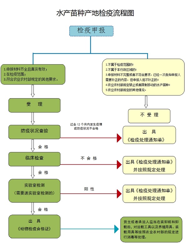 (五)开展检疫。各区、市的水产苗种产地检疫申报点受理检疫申报后,应当派出渔业官方兽医到现场或指定地点实施检疫。渔业官方兽医应按照农业农村部检疫规程进行检疫。经检疫合格的,出具水产苗种产地检疫合格证明。临床健康检查具有疑似规定疫病或者现场健康检查异常的水产苗种,需经有资质的实验室按照相应疫病检测技术规范进行检测。实验室检测到疫病病原呈阳性时,应及时反馈,24小时内由各区、市渔业主管部门报市海洋发展局,并由渔业官方兽医出具《水产苗种产地检疫处理通知单》,各区、市渔业主管部门按照法定程序报送疫情,及时发布预警预报信息,组织做好阳性养殖场净化和突发疫情处置。具体包括: