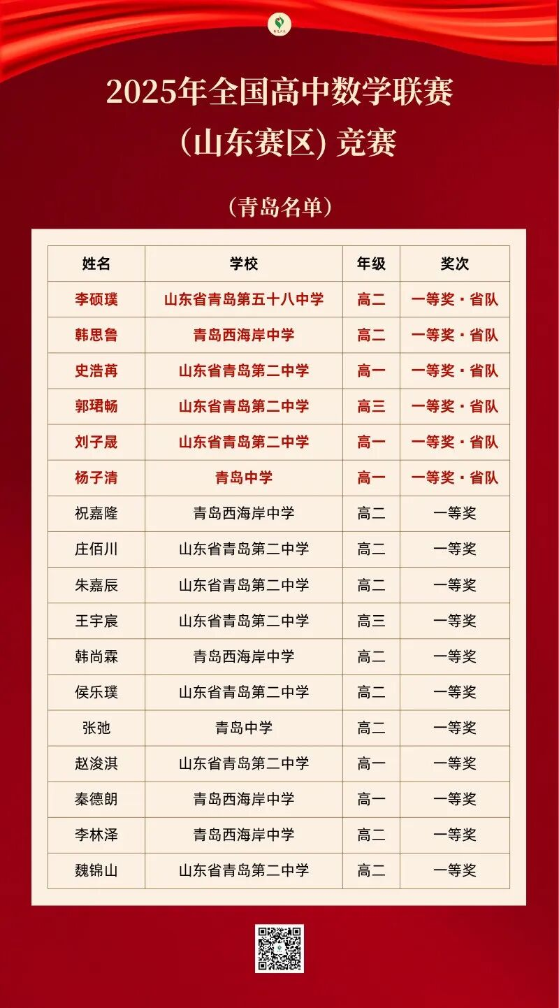 近日,2025年全国高中数学联赛(山东赛区) 竞赛结果揭晓,共产生一等奖90人,其中19人入选省集训队。我市共有17名学生荣获全国初赛一等奖,占全省一等奖总人数的18.9%;其中6名学生成功入选省集训队,占全省集训队人数的31.6%,取得了历届省赛最好成绩。
