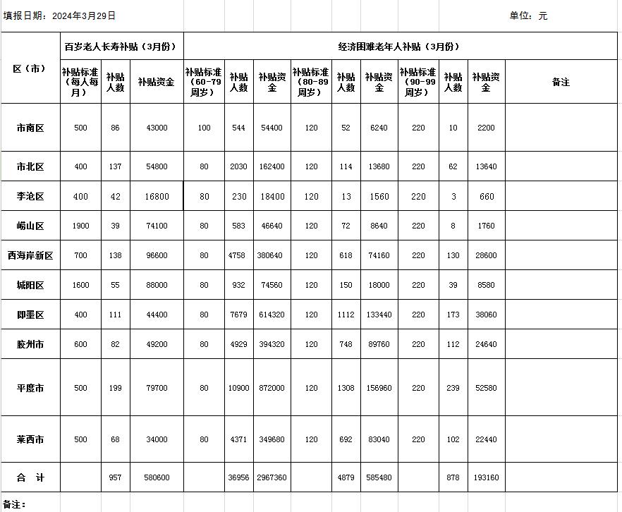 2024年3月特殊老年人补贴资金发放情况