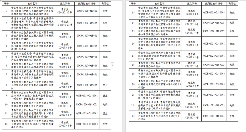 青岛市农业农村局失效和废止部门行政规范性文件目录