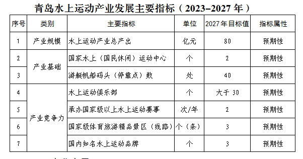 ——产业规模进一步扩大。水上运动市场容量明显扩大,产业供给能力不断提升,水上运动赛事表演、休闲服务、装备制造、教育培训等产业业态梯次发展。到2027年,水上运动产业总产出达到80亿元。