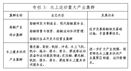 重点发展水上运动赛事表演、会展、休闲服务、制造、教育培训等业态,强化集聚效应,推动形成水上运动产业集群。