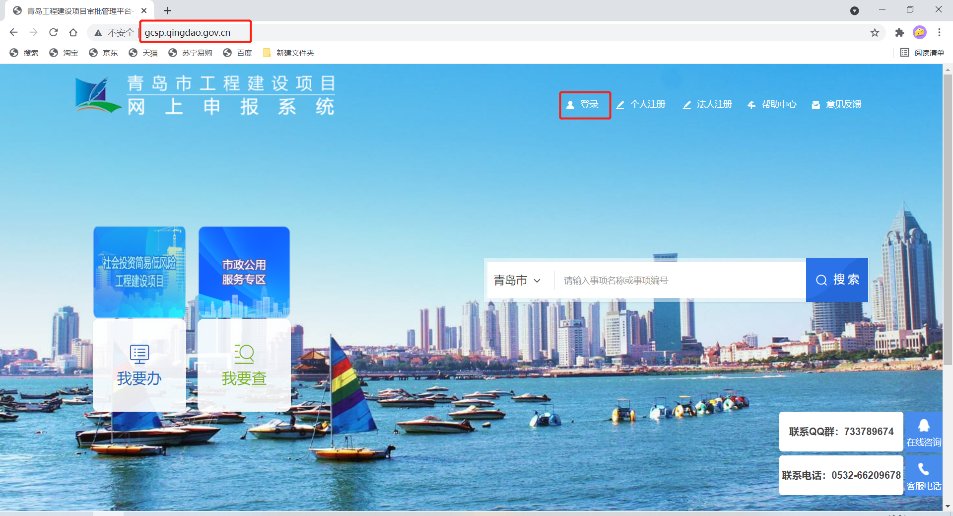 1.进入青岛工程建设项目审批管理平台(网址:http://gcsp.qingdao.gov.cn/),点击“登录”按钮;