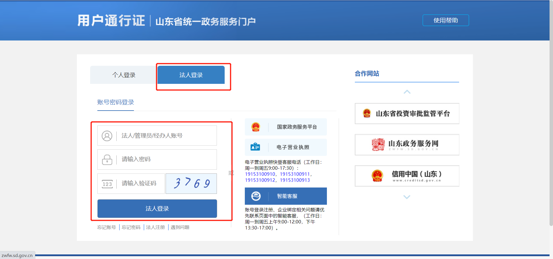 2.点击“法人登录”,输入法人账号信息及验证码后登陆,如未注册用户请先注册;