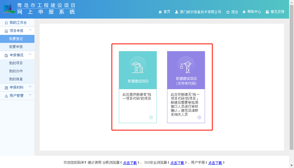 4.项目有发改立项24位中央代码的,选择“新建建设项目”进行登记,项目没有发改立项24位中央代码的,选择“新建建设项目(无中央代码)”进行登记;