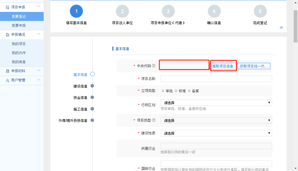 5.选择“新建建设项目”后,将中央代码填入点击提取项目信息,并将剩余必填项信息填好,点击“下一步”;
