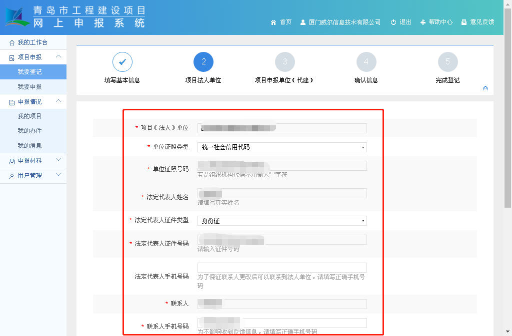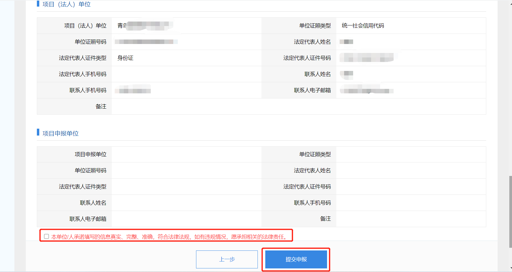 6.填写项目法人单位信息,点击“下一步”;