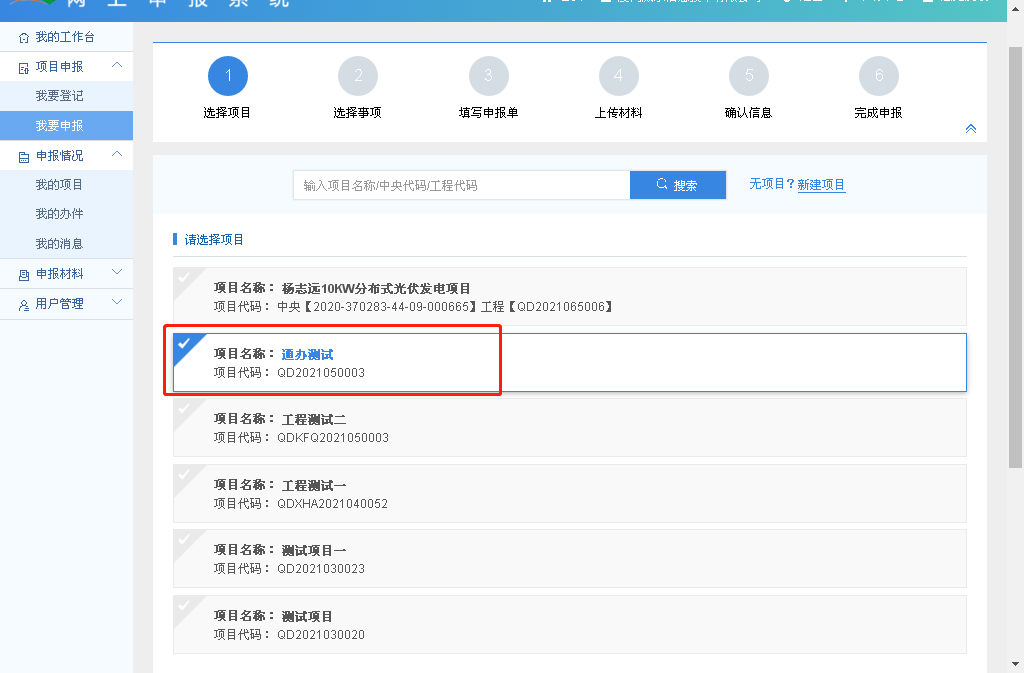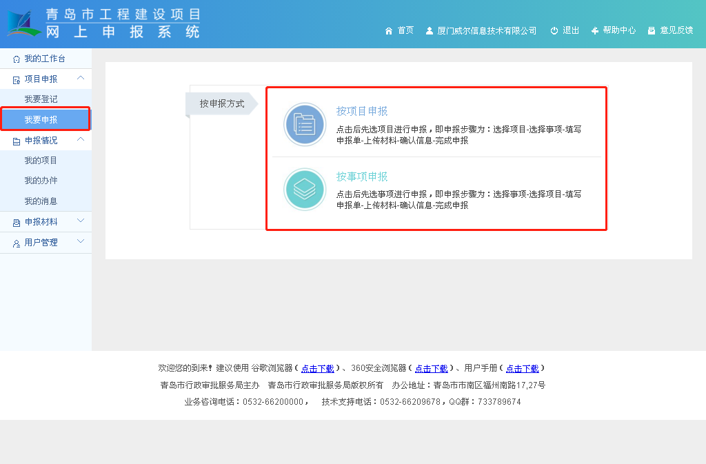 8.项目登记成功后,点击“我要申报”按钮,可选择“按项目申报”或“按事项申报”都可以;