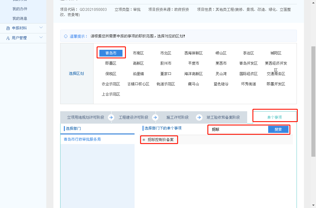 10.选择行政区划,再点击“单个事项”,在搜索框中输入关键字“招标”,选择“招标控制价备案”,点击“下一步”;