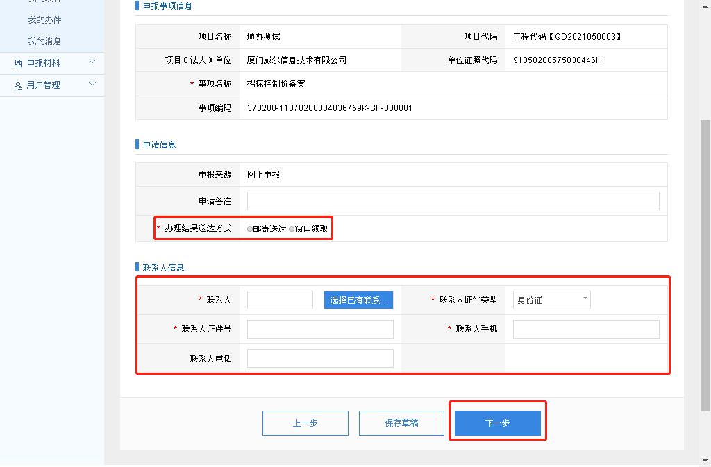 11.填写申请表,选择“办理结果表送达方式”,填写联系人信息后,点击“下一步”;