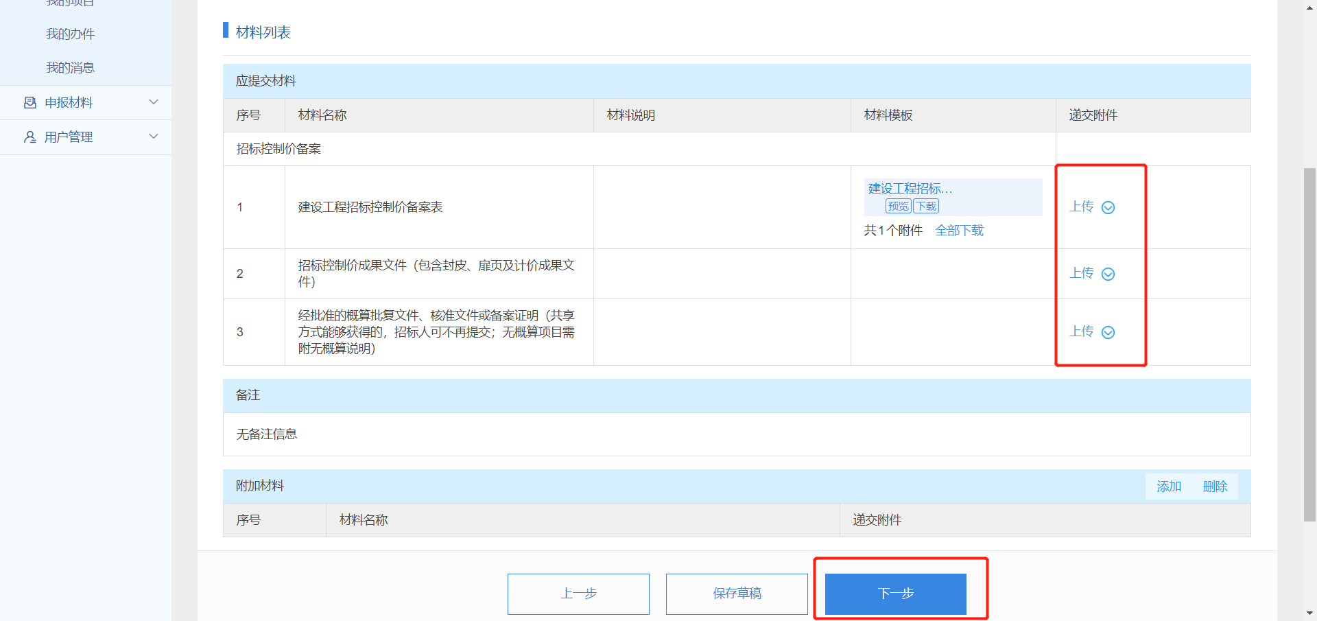 12.上传附件材料,点击“下一步”;