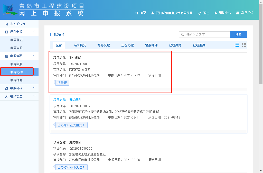 14.提交成功后可在“我的办件”中查看该办件的办理状态。
