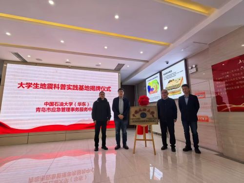 1月30日下午,中国石油大学(华东)大学生地震科普实践基地揭牌仪式在青岛防震减灾市级示范中心举行。青岛市应急管理局一级调研员王海明、石油大学地球科学与技术学院院长宗兆云及西海岸新区应急局局长沈久波参加仪式,会后就深化合作开展座谈。