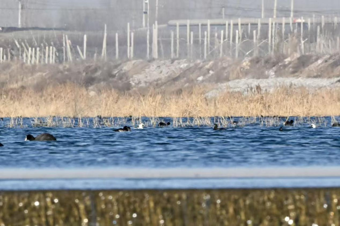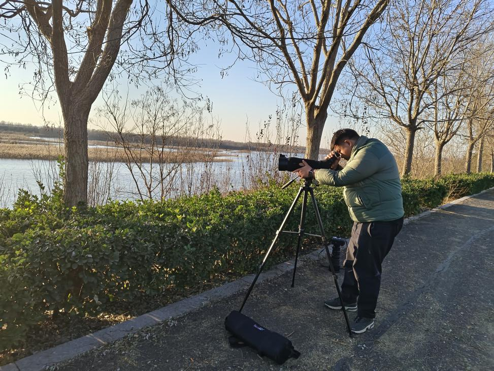 工作人员正在对已抵达大沽河的越冬水鸟进行监测