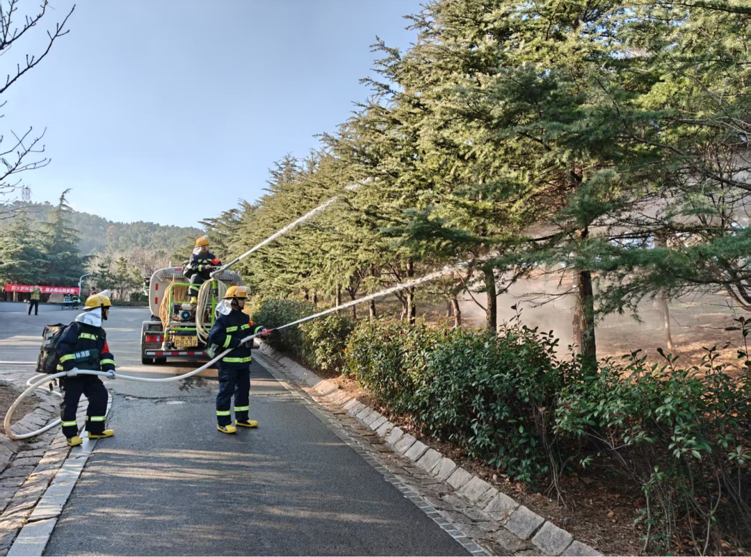 浮山森林公园横跨市南、市北、崂山三区,是城市建成区内最大的山林绿地,植被茂密、人流量大,跨区交界地带管控情况复杂。演练模拟浮山森林公园幸福谷发生火情,全面检验了从监测预警、应急响应到火灾扑救、人员疏散、火场清理的全链条处置能力。演练中,无人机与地面力量协同侦察,实时共享火场信息;三区救援队伍紧密配合,高效扑灭明火,有序引导“群众”转移。整个过程指挥顺畅、配合默契,有效锤炼了队伍的快速反应和协同处置能力。