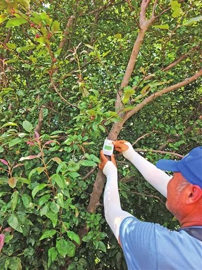 工作人员将装有柞蚕蛹的纸袋精准悬挂在树干向阳处。