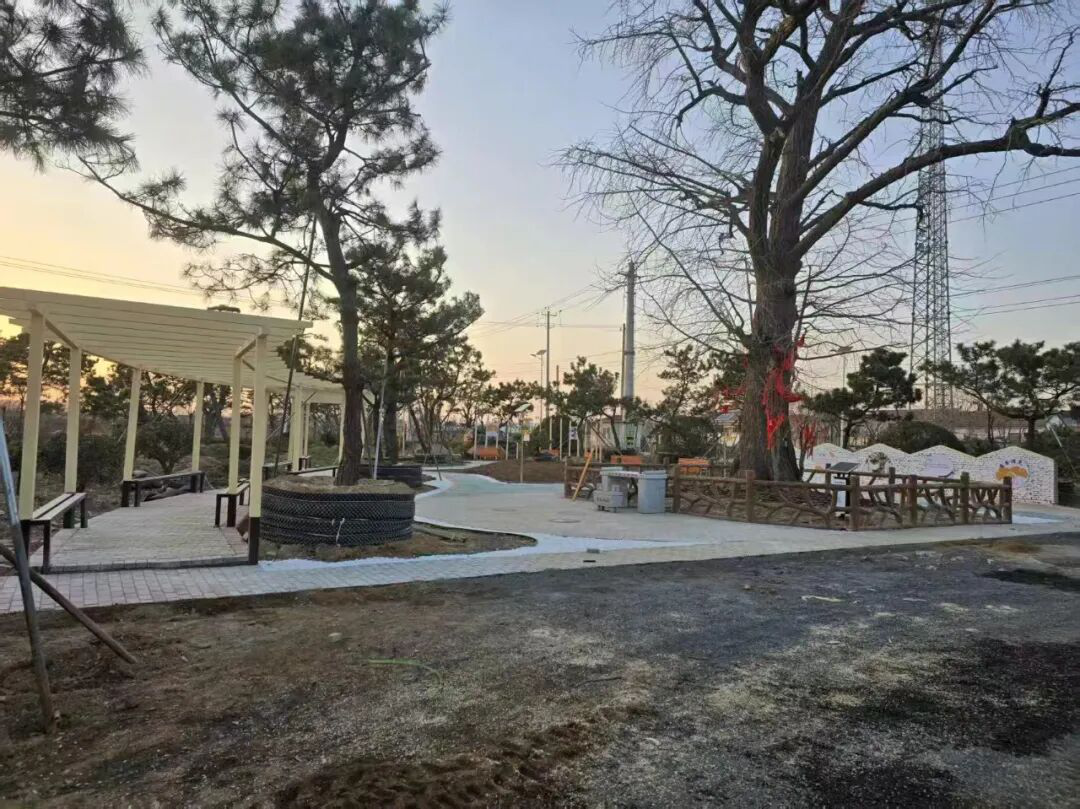 刘家屯村古树公园的核心为两株树龄150余年的三级古树(圆柏与侧柏)。针对早年因集市活动导致的土壤板结、树体受损等问题,市园林和林业局于2022年组织专家实施抢救性复壮,通过地下土壤改良、有害生物综合治理及树洞仿生修补等科学措施,使古树重焕生机。2025年3月,公园建设正式启动,仅用两个月便完成1134平方米的环境整治。公园划分入口区、科普区、休憩区及核心保护区,青石板步道蜿蜒其间,樱花树、五角枫等景观苗木相映成趣,配套的凉亭、休息椅与古树文化宣传栏,让这里成为村民家门口的“休闲客厅”。特别值得一提的是,园区引入了智慧管护系统,安装太阳能诱虫灯及远程监测站,实现了古树健康监测与市民休闲游憩功能的有机统一。“以前是杂乱荒地,现在变成漂亮公园,外村人都慕名来参观! ”65岁的村民刘娇芝望着枝繁叶茂的古树,难掩心中喜悦。