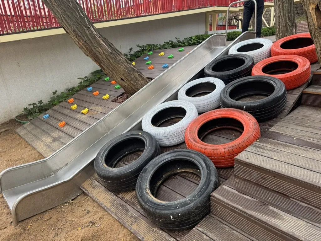 走下廊桥,则来到了另一方天地。地面铺装塑胶面层,廊桥的一侧设置了乒乓球桌以及适老化休憩座椅,方便居民健身休闲;另一侧则根据坡地地势打造林下休闲活动广场,靠近住宅区域开辟了儿童活动区,增加滑梯、沙坑、攀爬游乐设施。这些设施充分考虑了不同年龄层市民的活动需求,打造了一个全龄友好的社区休闲场所。