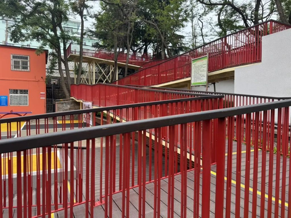 下车后,先映入眼帘的是一条蜿蜒而下的红色廊桥。“这里整体地势高差较大,高差最大处约8米,周边居民交通极不方便,安全隐患较大。所以设计方案重新梳理交通动线,满足适老化要求,增加无障碍廊桥。”工作人员介绍。