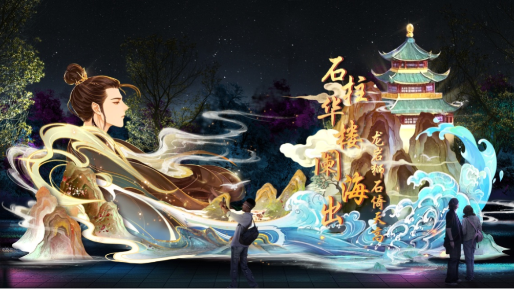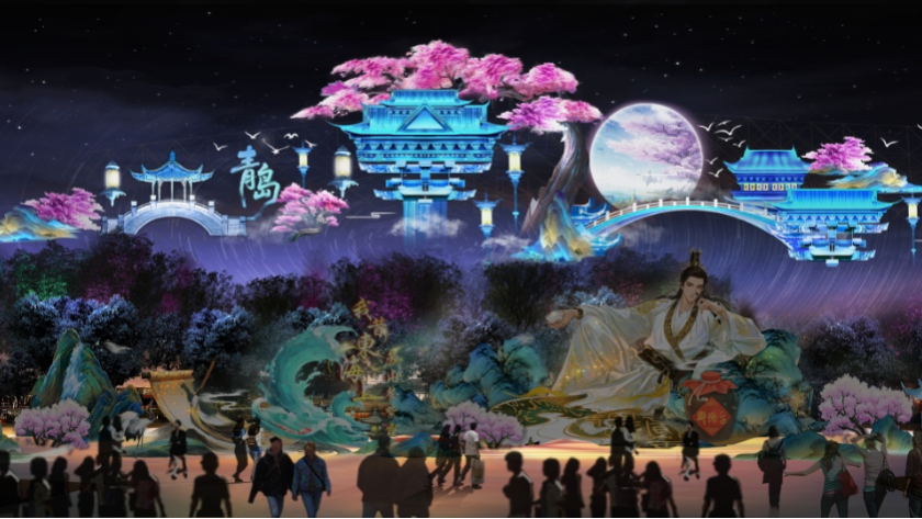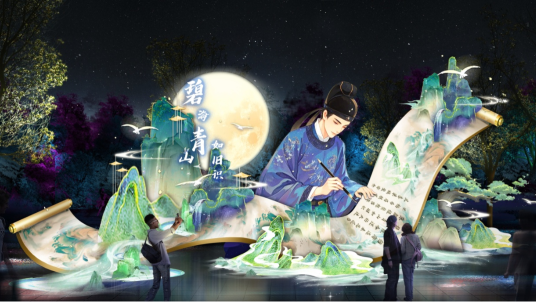 以青岛的诗词文脉为纽带,融合崂山山水、传统建筑与现代光雕技术,将历代文人墨客笔下的山海神韵,化作流光溢彩的灯组在光影中徐徐铺展。