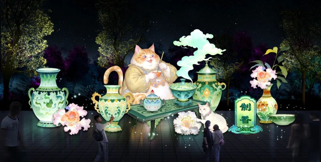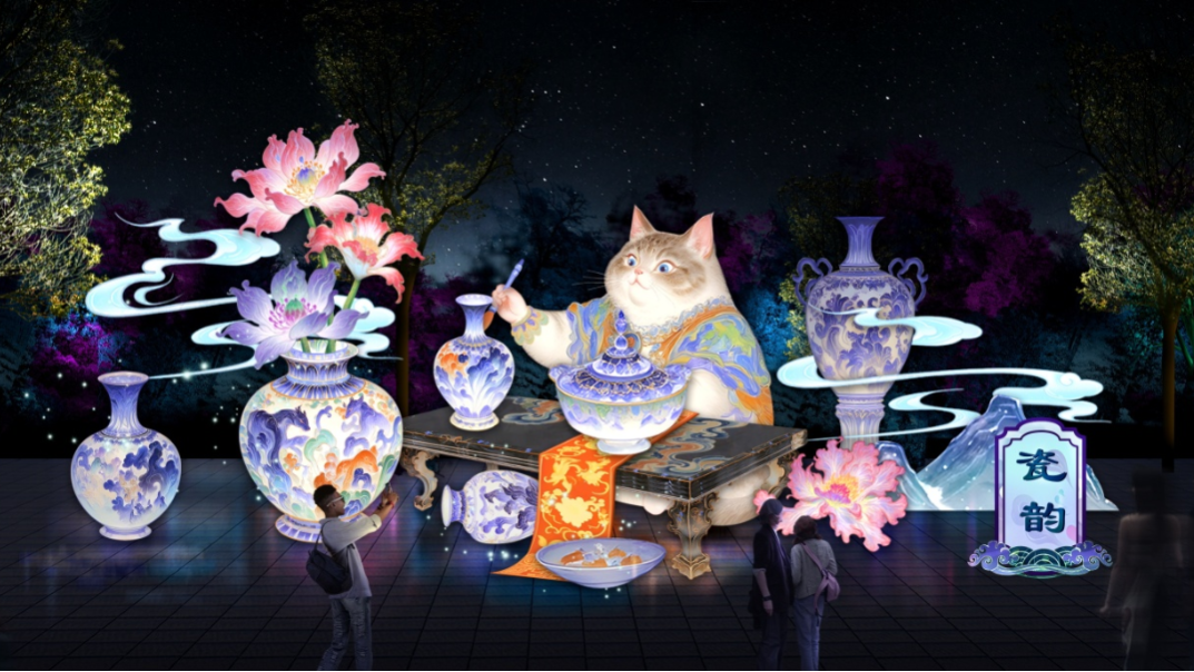 该区域位于北大草坪及以西部分区域,由“崂韵流光”“漫步鲜花镇”“机甲悟空”“瓷韵”“制香”“点茶”“书画”“月阙云谣”等灯组组成。