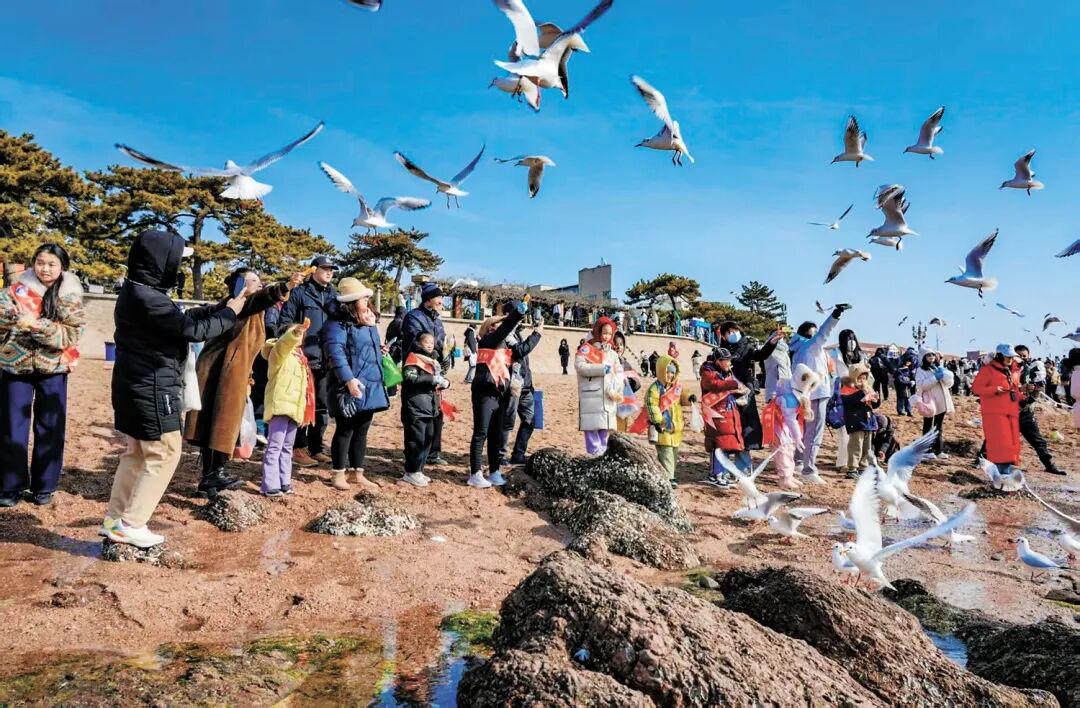 冬日的栈桥边,“科普宣传、净滩护栖、文明观鸥”志愿服务活动热闹非凡。青岛市园林和林业局的专业技术人员,来到现场为孩子和家长们讲解鸟类知识,内容专业又有趣,大家听得津津有味。在工作人员的指导下,大家拿着鸥粮,遵循科学投喂原则,与海鸥亲密互动。孩子们轻轻将鸥粮抛向空中,海鸥凌空盘旋、精准衔食,灵动的身影与湛蓝的海水相映成趣,岸边的欢声笑语久久回荡。在这场互动体验中,大家不仅感受到了海鸥的可爱,更明白了规范投喂、文明观鸥,对保护鸟类健康、维护生态平衡的重要意义。