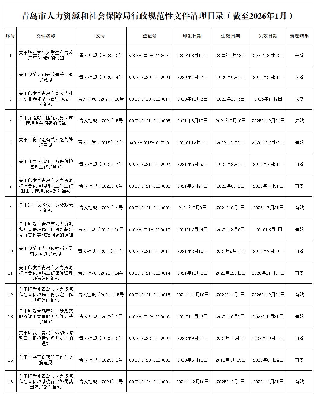 青岛市人力资源和社会保障局行政规范性文件清理目录(截至2026年1月)