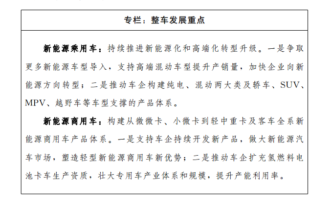 1.乘用车倍增发展。支持企业加快畅销新能源车型的研发和上市,积极争取整车企业在我市布局高端畅销车型,提升中高端新能源车型产销量,提高现有整车企业产能利用率。深化与相关企业集团联系机制,开展更深层次战略合作,争取新整车项目落地。(责任单位:市工业和信息化局、市发展改革委,有关区、市政府。以下各项工作均需有关区、市政府落实,不再一一列出)