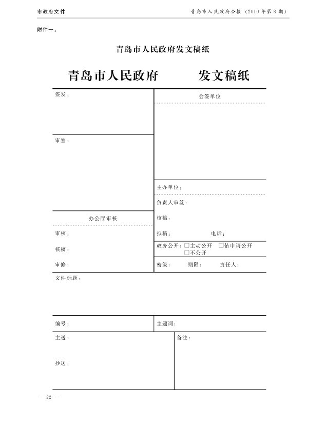 八、政府公文代拟稿部门和单位拟稿完毕后,要准确填写发文稿纸。拟稿人应在发文稿纸上清楚填写主办单位名称、主送机关、抄送机关,并在“拟稿”栏内签署姓名和时间、联系电话;分管保密工作的单位负责人应确定公文密级和政务公开选项(选“不公开”项的要简要说明理由),并在相应栏内签署姓名;主办单位办公室主任(秘书处处长)对代拟公文审核无误后,在“核稿”栏内签署姓名和时间;主办单位领导审核后,在“负责人审签”栏内签署姓名和时间。
