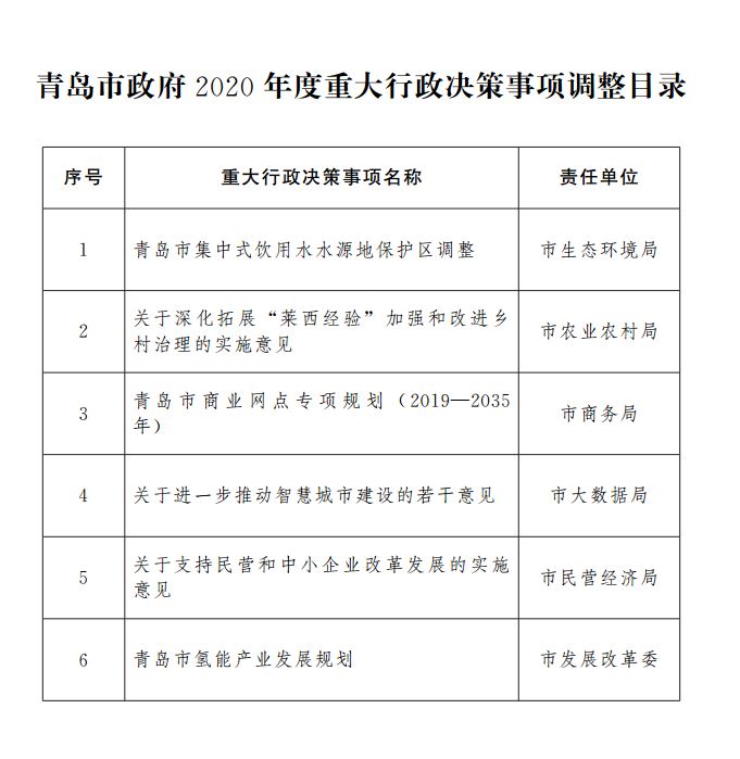 为进一步规范重大行政决策程序,促进政府科学、民主、依法决策,提高决策质量和效率,现将调整后的青岛市政府2020年度6件重大行政决策事项予以公布。列入目录清单动态管理的重大行政决策事项须于2020年12月31日前完成。各有关部门和单位要严格按照公众参与、专家论证、风险评估、合法性审查的法定程序开展前期工作,并适时提交市政府常务会议审议决定。