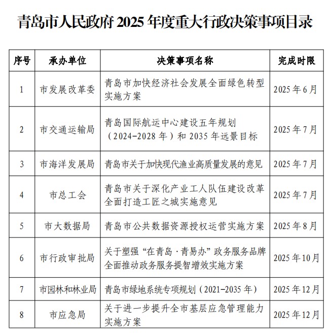 为规范重大行政决策程序,促进政府科学、民主、依法决策,提高决策质量和效率,按照《青岛市重大行政决策程序规定》(市政府令第271号)要求,经市委、市政府研究同意,市政府办公厅组织市政府各部门对2025年重点工作事项进行了梳理,筛选出具有基础性、全局性和影响面广的8项决策事项,决定纳入青岛市人民政府2025年度重大行政决策事项范围,实行目录清单管理。各有关部门和单位要严格按照公众参与、专家论证、风险评估、合法性审查的法定程序开展前期工作,并适时提交市政府常务会议审议。