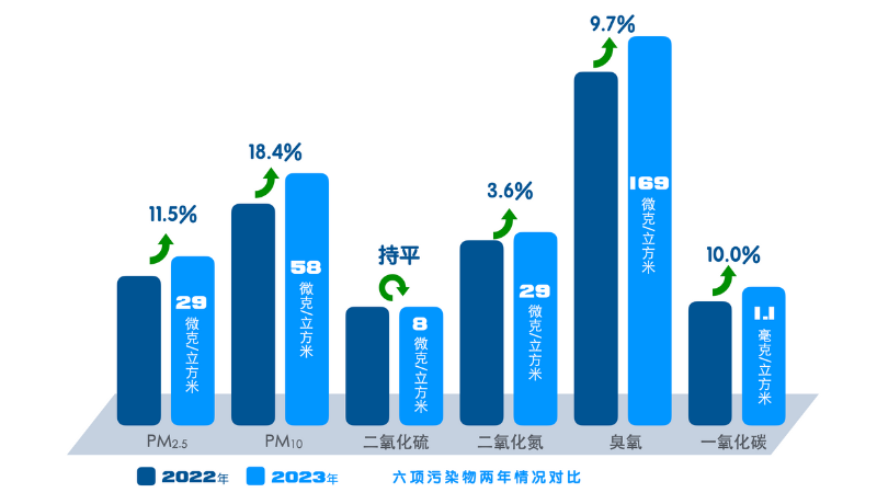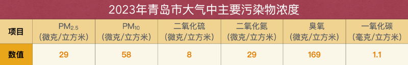 2023年,青岛市环境空气中PM2.5、PM10、二氧化硫、二氧化氮、臭氧浓度分别为29、58、8、29、169微克/立方米,一氧化碳浓度为1.1毫克/立方米。六项污染物中,PM2.5、PM10、二氧化硫、二氧化氮、一氧化碳浓度均符合《环境空气质量标准》(GB3095-2012)中二级标准,臭氧浓度超过二级标准0.06倍,与2022年相比,PM2.5、PM10、二氧化氮、臭氧、一氧化碳浓度分别升高11.5%、18.4%、3.6%、9.7%、10.0%,二氧化硫浓度持平。空气质量优良率82.2%,全省排名第四。