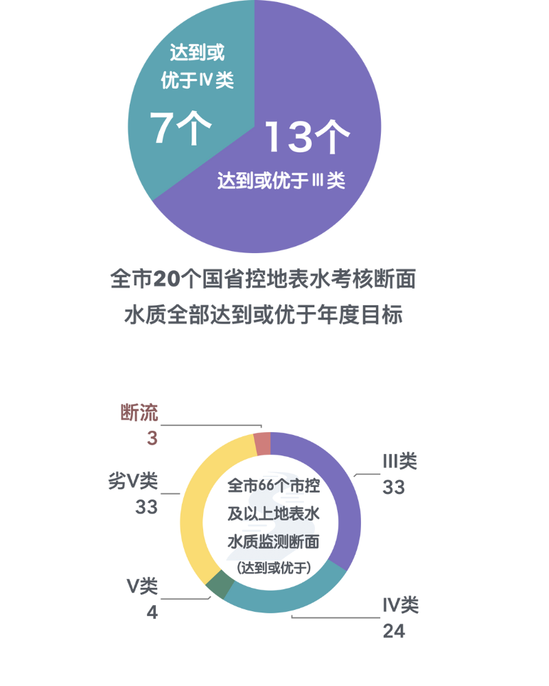 2023年,城镇集中式饮用水水源地水质达标率100%。全市20个国省控地表水考核断面水质全部达到或优于年度目标,达到或优于Ⅲ类13个,Ⅳ类7个。全市66个市控及以上地表水水质监测断面中,断流3个,达到或优于Ⅲ类33个,Ⅳ类24个,V类4个,劣V类2个。五沽河、现河等河流水质未达到考核目标要求。