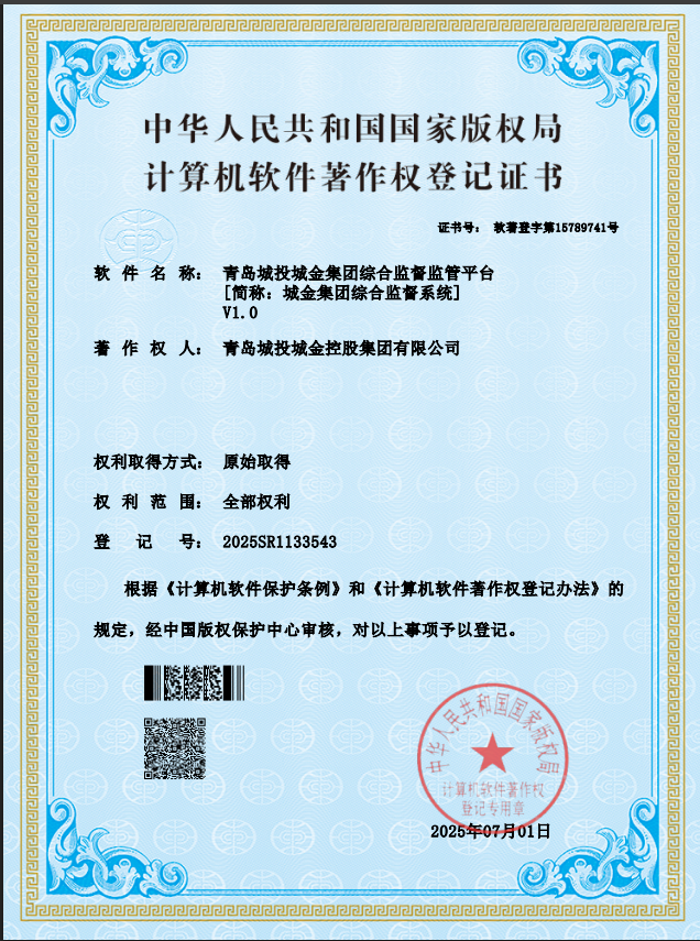 近日,青岛城投城金集团数字化综合监督系统经中国版权保护中心审核,获得中华人民共和国国家版权局授予的原始取得的《计算机软件著作权登记证书》。